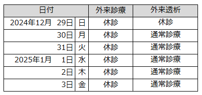 2024年12月29日から2025年1月3日にかけての年末年始期間中の外来休診は以下のとおりになります。